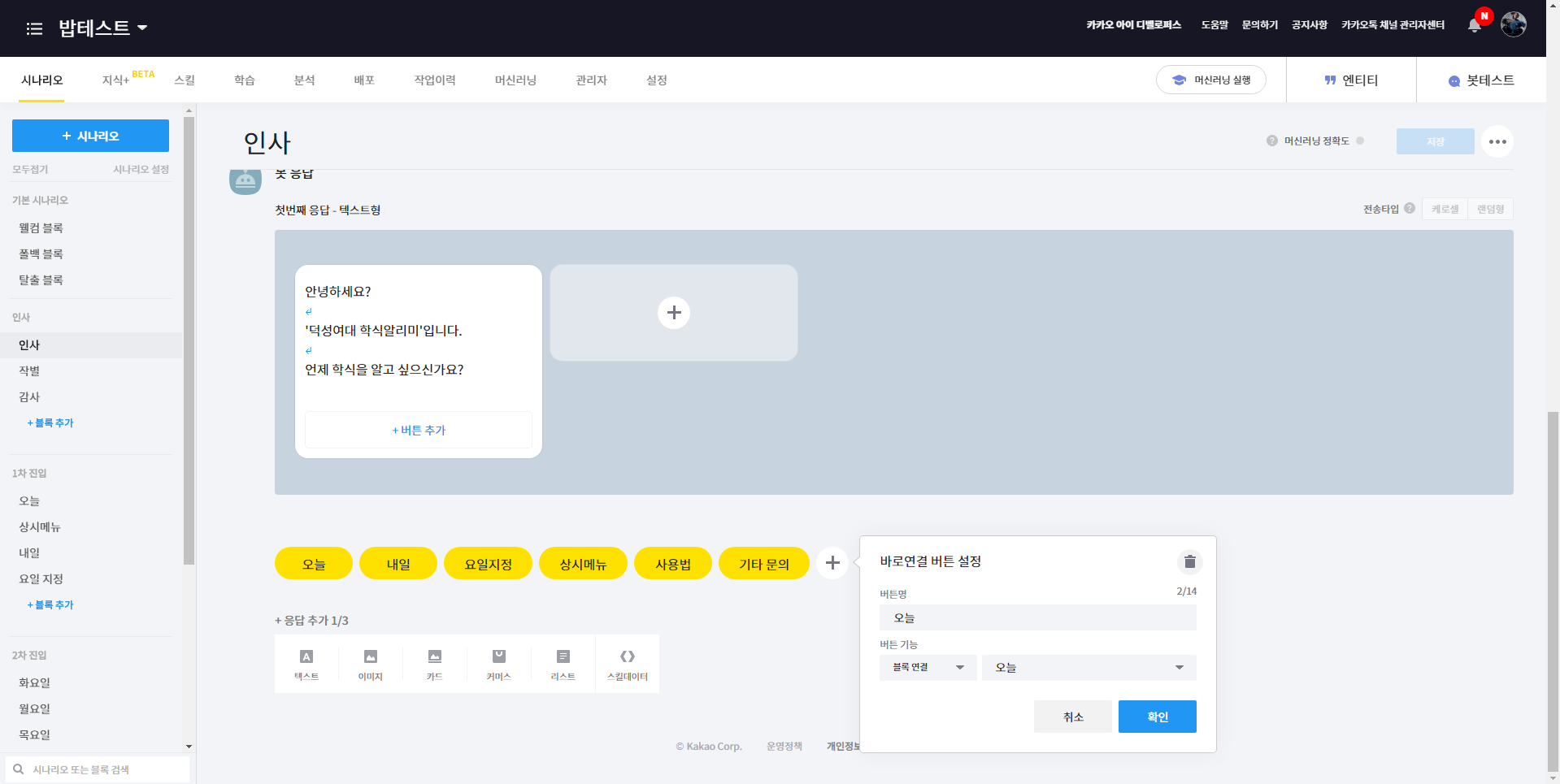 저는 '밥테스트'라는 챗봇을 만들어 인사, 1차 진입, 2차 진입, 정보 총 4가지 시나리오를 만들고 그 아래 블록을 만들었습니다. 시나리오를 만들고 블록을 나누는 건 사실 시스템상으로는 그렇게 큰 의미는 없는 것 같습니다. 그냥 작업자들이 작업할 때 어느 정도 응답의 영역을 나눠준다 정도로 생각하고 저는 위와 같이 4개로 나눴습니다. 그 중 인사, 정보 블록은 스킬을 적용하지 않고 텍스트형으로 그냥 응답하도록 했습니다.