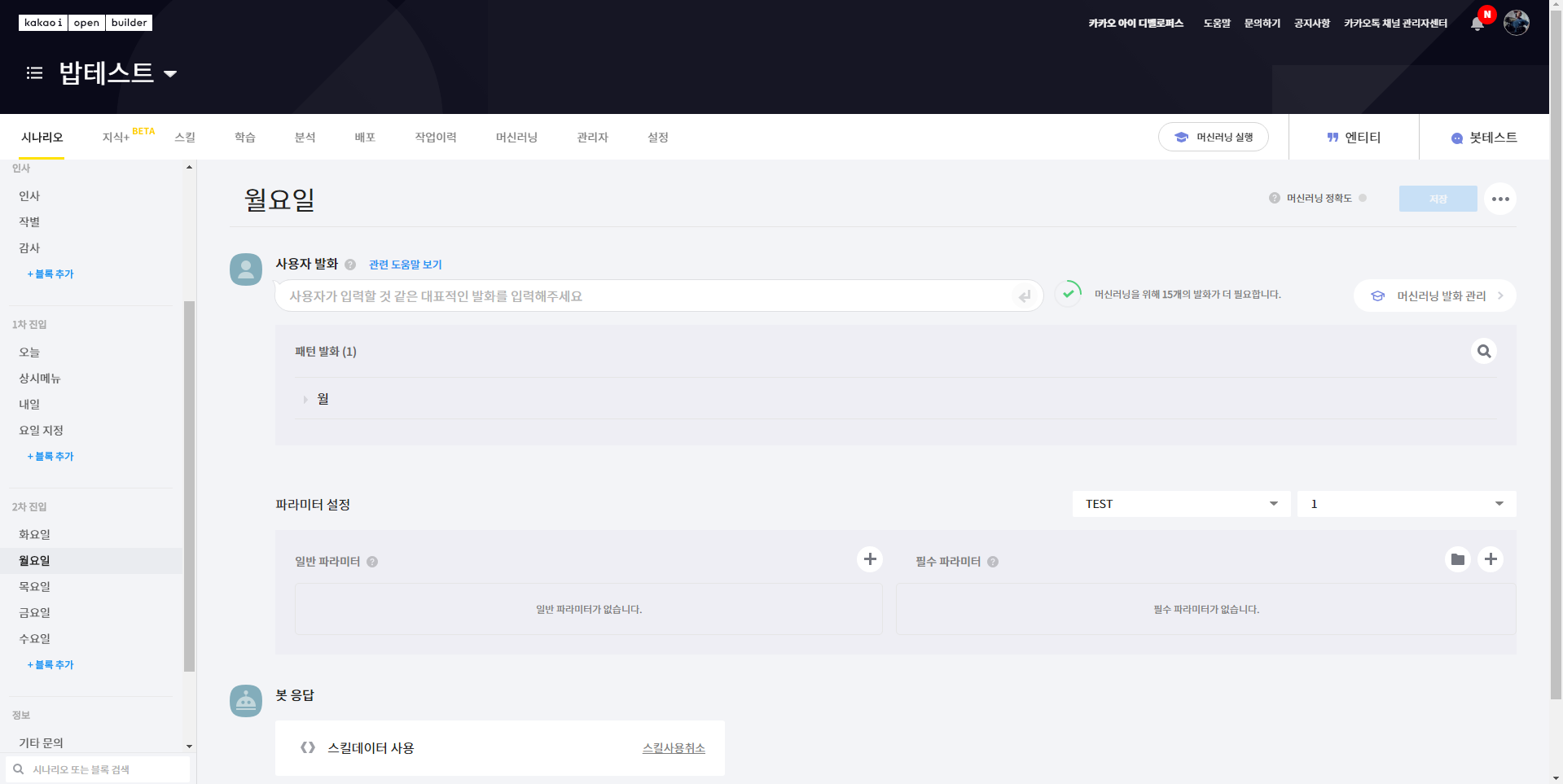 이 때 패턴 발화를 등록하게 되는데 현재까지 제가 시도해본 바로는 패턴 발화를 여러 개 등록해봤자 views 파일에서 여러 경우의 수로 if 문을 주지 않는 이상 다른 패턴 발화로는 결과를 얻는 것이 불가능했습니다. (자세히 아시는 분은 댓글 부탁드립니다) 그래서 저는 간단하게 2차 진입에서는 월, 화, 수, 목, 금으로 지정했습니다(views 파일을 보면 실제로도 이 발화가 들어왔을 때 응답을 주게 되어 있습니다).
