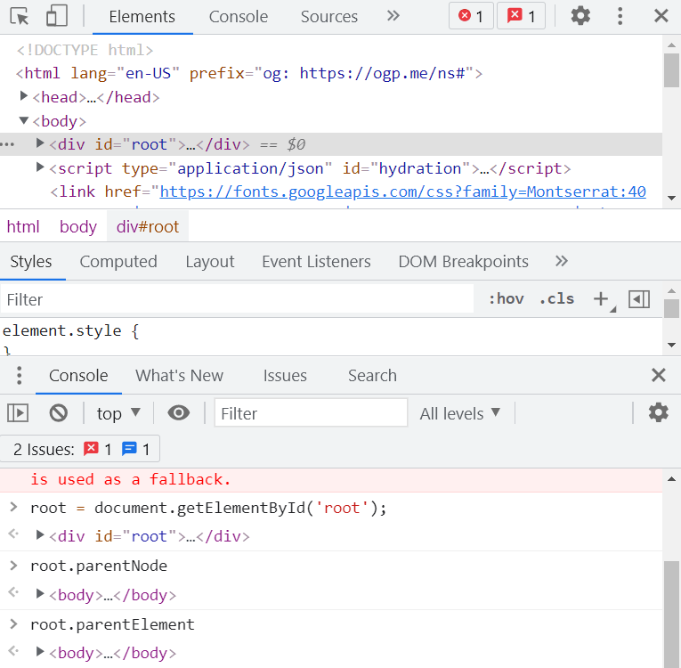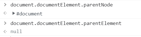 document.documentElement의 부모는 document인데, DOM 트리에는 document '요소'라는 건 없기 때문이다. 대신 document는 그냥 DOM 객체(document node)로서 존재한다. 이것은 HTML 문서 최상위 요소인 html에 적용해도 같은 결과가 나온다.