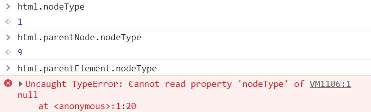 방금 위에서 소개한 스택오버플로우 답변글에는 nodeType별로 type-value이 적힌 표가 있는데, 여기서 1번은 ELEMENT_NODE라고 했으니, 분명 html.parentNode는 1번이 아닐 것이다. 정말 그런지 확인해 보자.