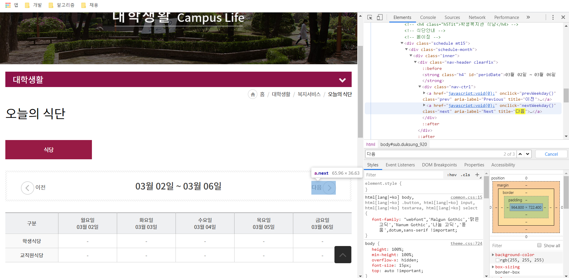 날짜 옆의 '다음'을 눌러야 다음 주 식단이 나올 텐데 어떻게 해야 할까요? 일단 '다음'을 누를 때 어떤 일이 일어나는지부터 확인해봐야겠습니다.