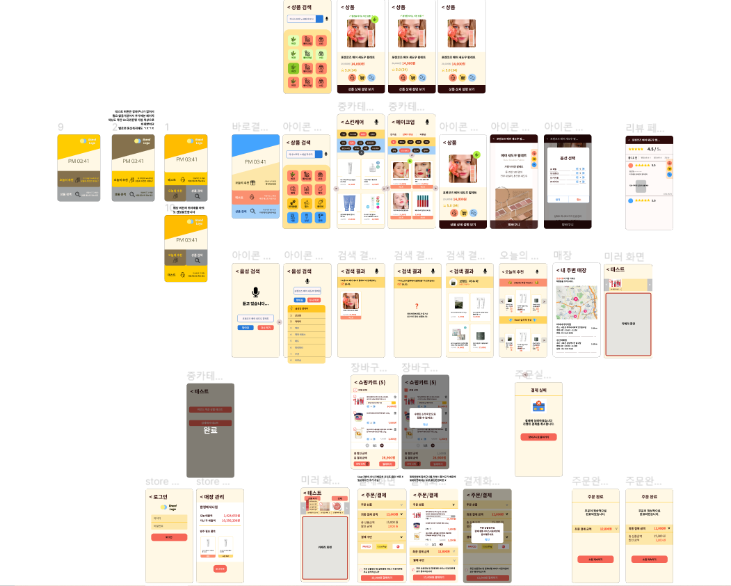 결국 스마트 미러 아이디어를 엎고, 다시 키오스크로 돌아왔다. 대신 이번에는 음성인식만 넣는 게 아니라 다른 인공지능 기술도 포함했으면 좋겠다는 의견에 오케이했다. 그래서 픽스한 주제는, 올리브영이나 랄라블라 같은 드럭스토어에 비치할 목적의 뷰티 키오스크를 만들자는 거였다. 음성 인식으로 상품이 있는지 검색해서 재고를 확인하고, 색조 화장품을 키오스크에서 즉석으로 테스트하고, 물건을 장바구니에 담아 결제하면 직원이 포장해서 바로 받아서 갈 수 있다는 그런 아이디어였다.
