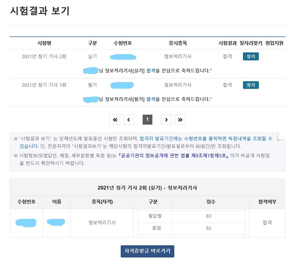 나도 필기는 책을 사지 않고 인터넷을 보면서 공부했다. 구글에 '2021 정처기 필기 정리' 이렇게만 검색해도 많은 사람들이 꼼꼼하게 정리를 잘해놨기 때문에 그거 보면서 이론 공부를 하면 되...지만 내 생각에는 그럴 필요도 없고 기출 문제를 5개 정도 풀고 오답 정리하면 붙을 수 있을 정도로 쉽다. 나는 필기 공부는 1주일 했고 전날 하루는 기출 문제 풀이를 했다. 그리고 결과는...