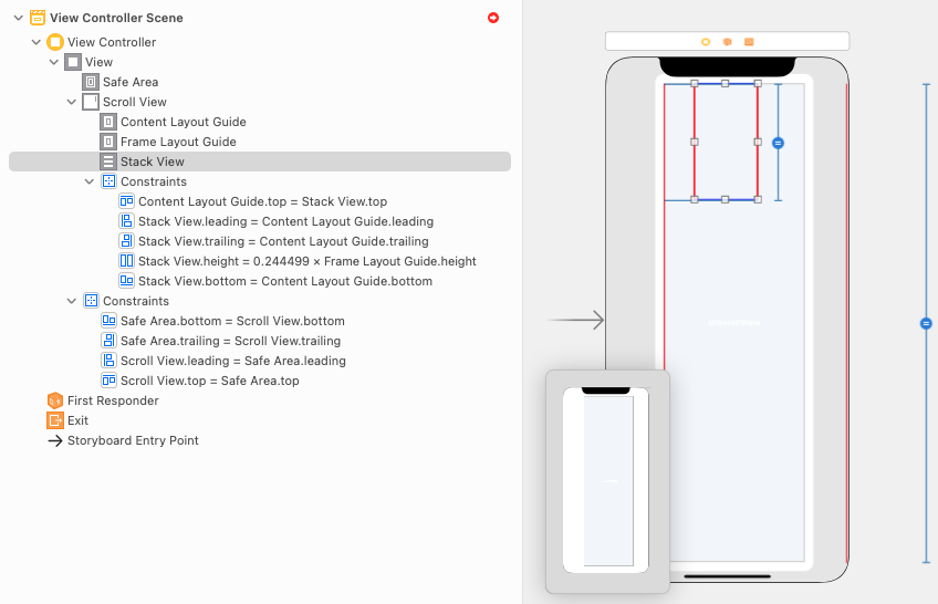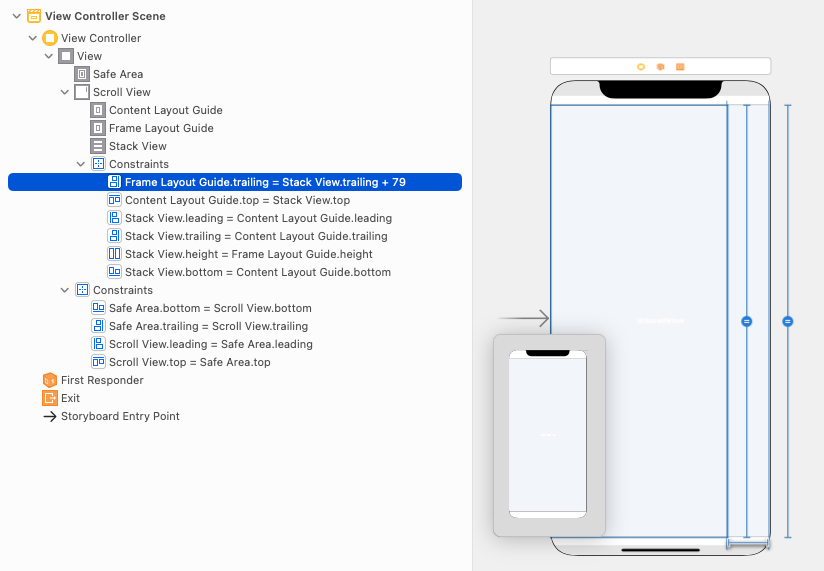 - (2)-(b) UIView를 ScrollView의 Frame Layout Guide trailing에 constraint 0으로 걸기, Eqaul Height 걸고 priority 250으로 조정