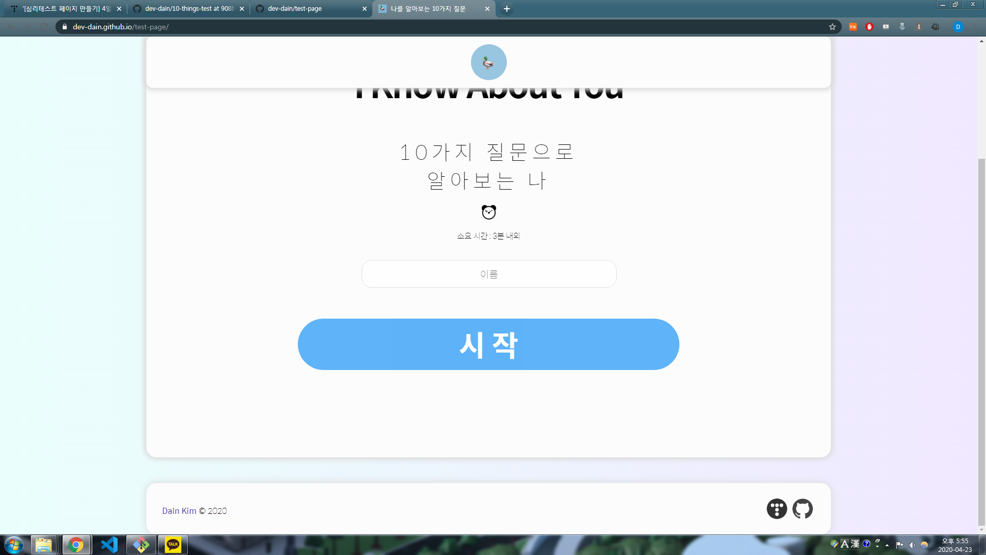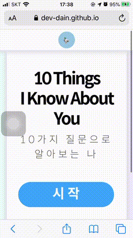나를 알아보는 10가지 질문 사람들이 보는 나는 어떤 이미지일까? dev-dain.github.io 5일 이 날은 만들다가 문득 그런 생각이 들더군요. '탭 버튼으로도 이동할 수 있게 만들어야 할 텐데 되나?' 시작 �
