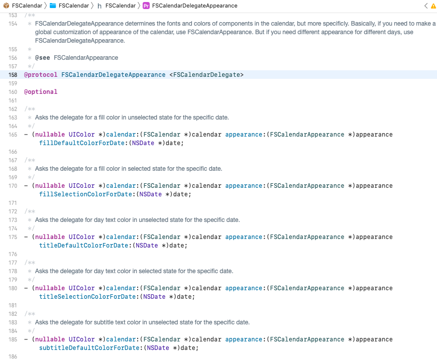 Jump to Definition 해서 가보면 FSCalendarDelegateAppearance 프로토콜 안의 여러 메소드들을 볼 수 있다.