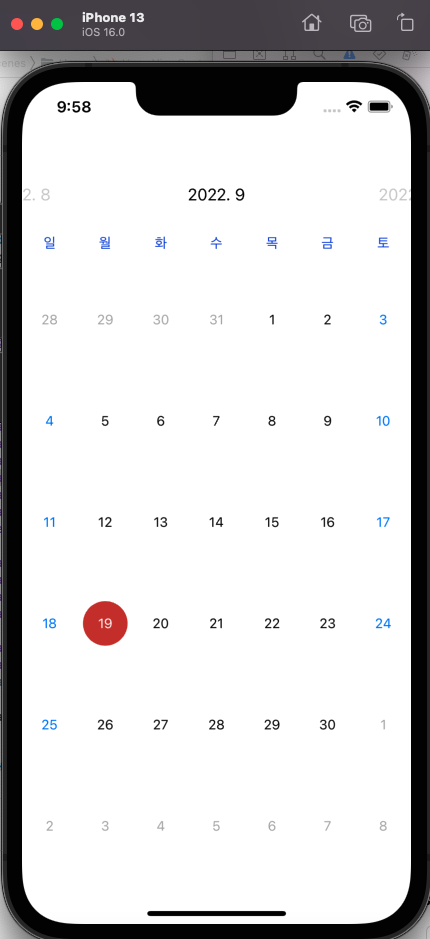주말만 색깔을 파랑색으로 바꿔보자. calendar.appearance에는 캘린더 뷰의 시각적 속성을 바꿀 수 있는 여러 가지 프로퍼티들이 제공된다. 이 중에서 titleWeekendColor 프로퍼티를 변경하면 된다. 이 코드를 calendar 안에 추가하자.