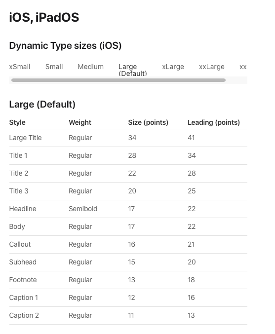 Specifications까지 내려보면 Dynamic Type의 스타일과 그 스타일이 크기 설정에 따라 몇 pt로 보이는지, 굵기는 어떤지 보여주는 표를 볼 수 있다. 아래 예시에서는 폰트 설정을 Large로 해둔 사람에게 각 스타일이 어떻게 보일지 보여주고 있다.