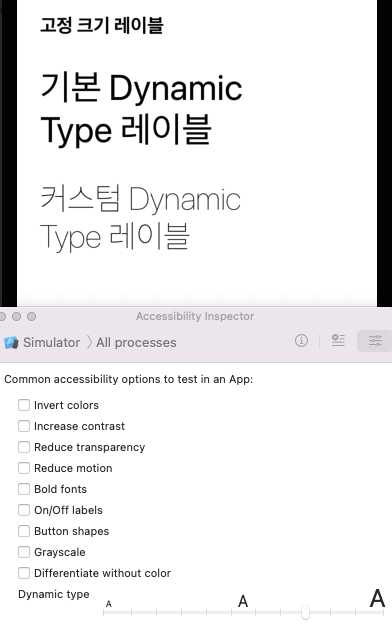 여기서 Xcode > Open Developer Tool > Accessibility Inspector를 선택하면 접근성에 대한 여러 가지 테스트를 할 수 있는 인스펙터 창이 나온다. Simulator를 선택하고, Dynamic Type을 늘려보자.