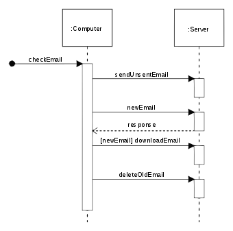 - lifeline 중간의 가늘고 긴 사각형은 객체가 현재 활동 중(CPU를 얻어 실행되는 상태)임을 나타낸다. 즉, 메소드 호출(메시지 전달)이 일어나고 있다는 것을 의미한다.