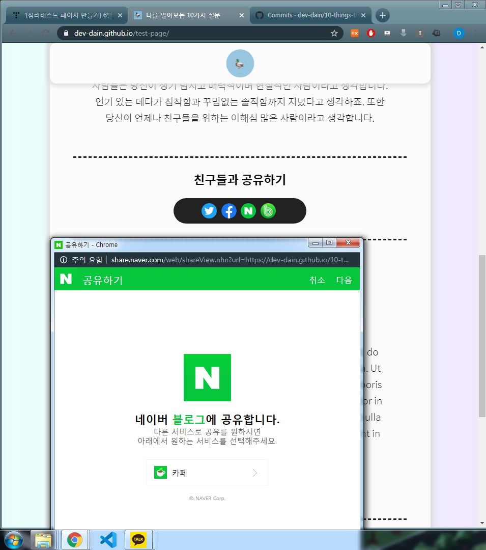 카카오톡과 카카오스토리 공유를 하려고 했지만 슬래시('/')가 url에 들어간 링크는 유효한 호스트 url이 아니라면서 거절당하는 바람에 못 했습니다(참고로 이건 깃허브 페이지이기 때문에 제 깃허브/레파지토리 이름 식의 url입니다. 슬래시가 필연적으로 들어갈 수밖에 없는 링크라 등록이 불가능합니다). 입맛이 씁니다