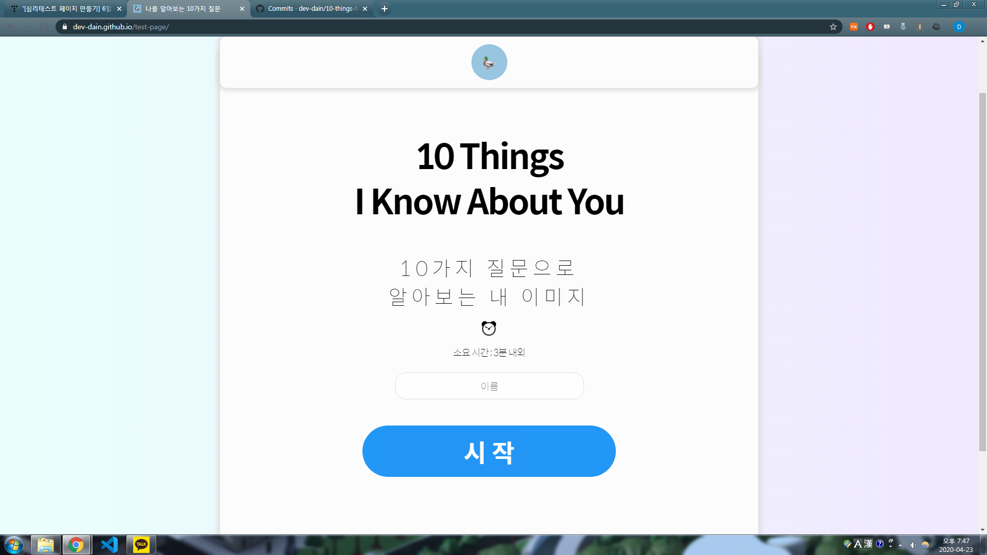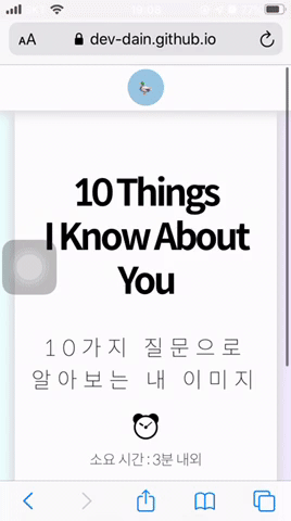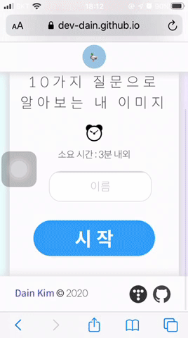 나를 알아보는 10가지 질문 사람들이 보는 나는 어떤 이미지일까? dev-dain.github.io 이전 글 보기 [이미지테스트 페이지 만들기] 0~1일 - 기획, 구조 짜기 나를 알아보는 10가지 질문 사람들이 보는 나�