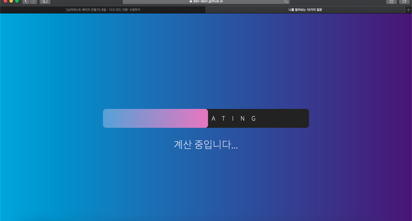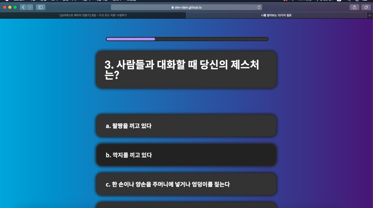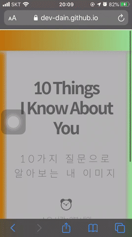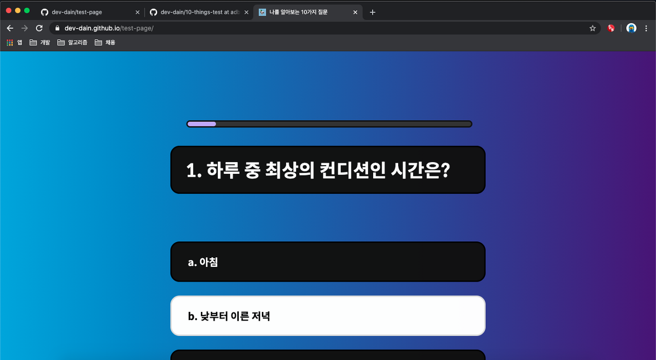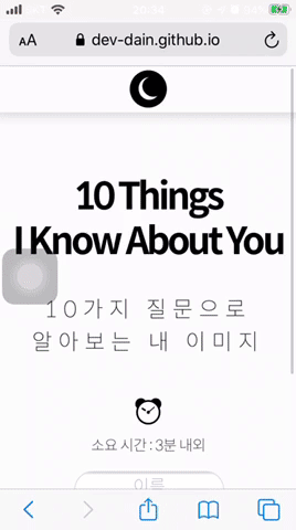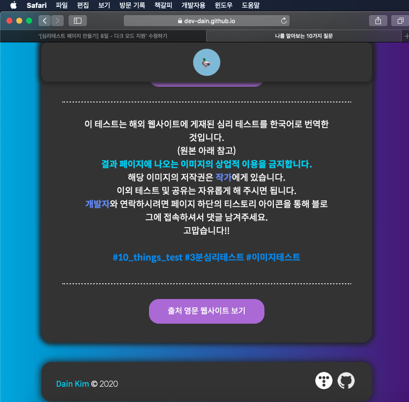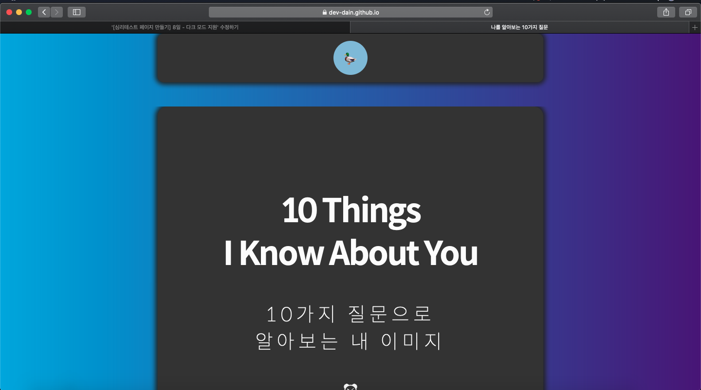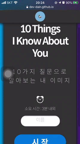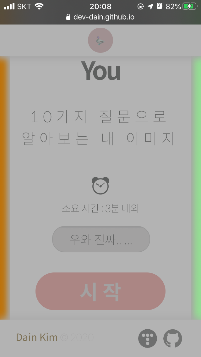 나를 알아보는 10가지 질문 사람들이 보는 나는 어떤 이미지일까? dev-dain.github.io 이전 글 보기 [이미지테스트 페이지 만들기] 2~4일 - 미디어 쿼리로 반응형 웹 만들기, CSS 애니메이션 나를 알아보�