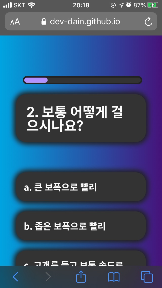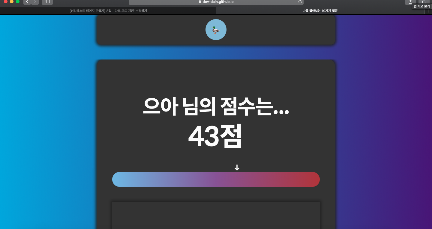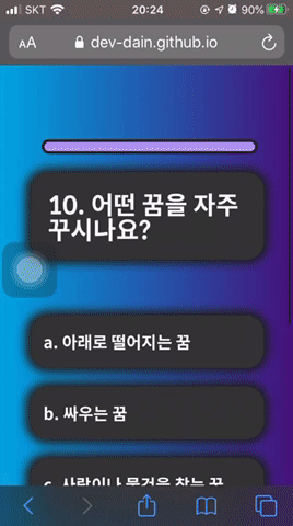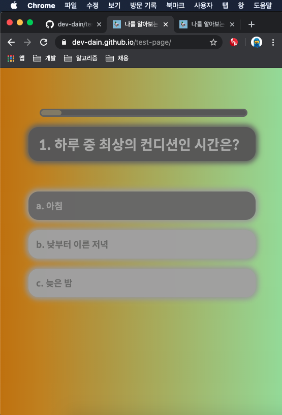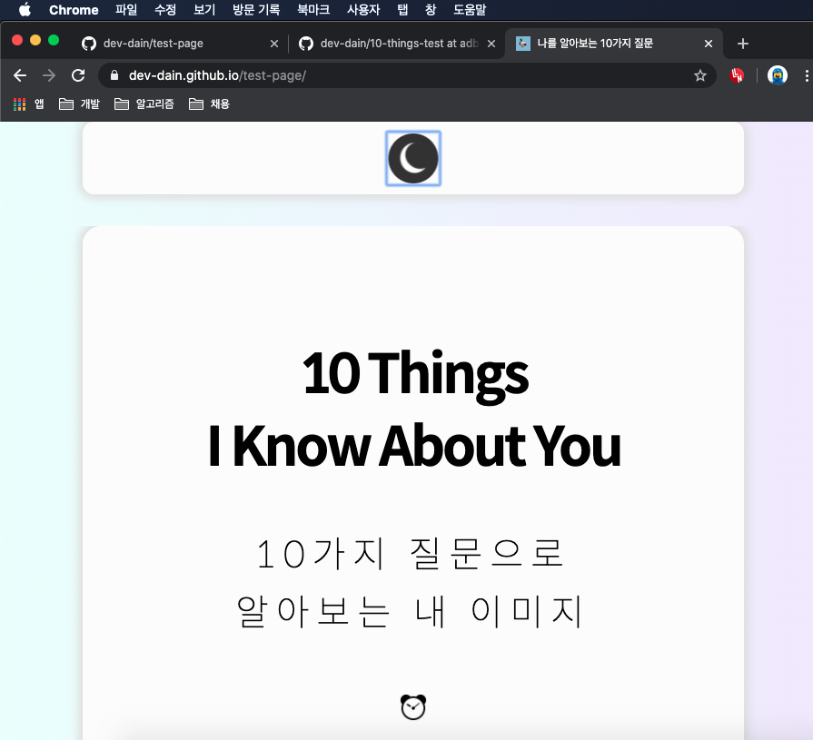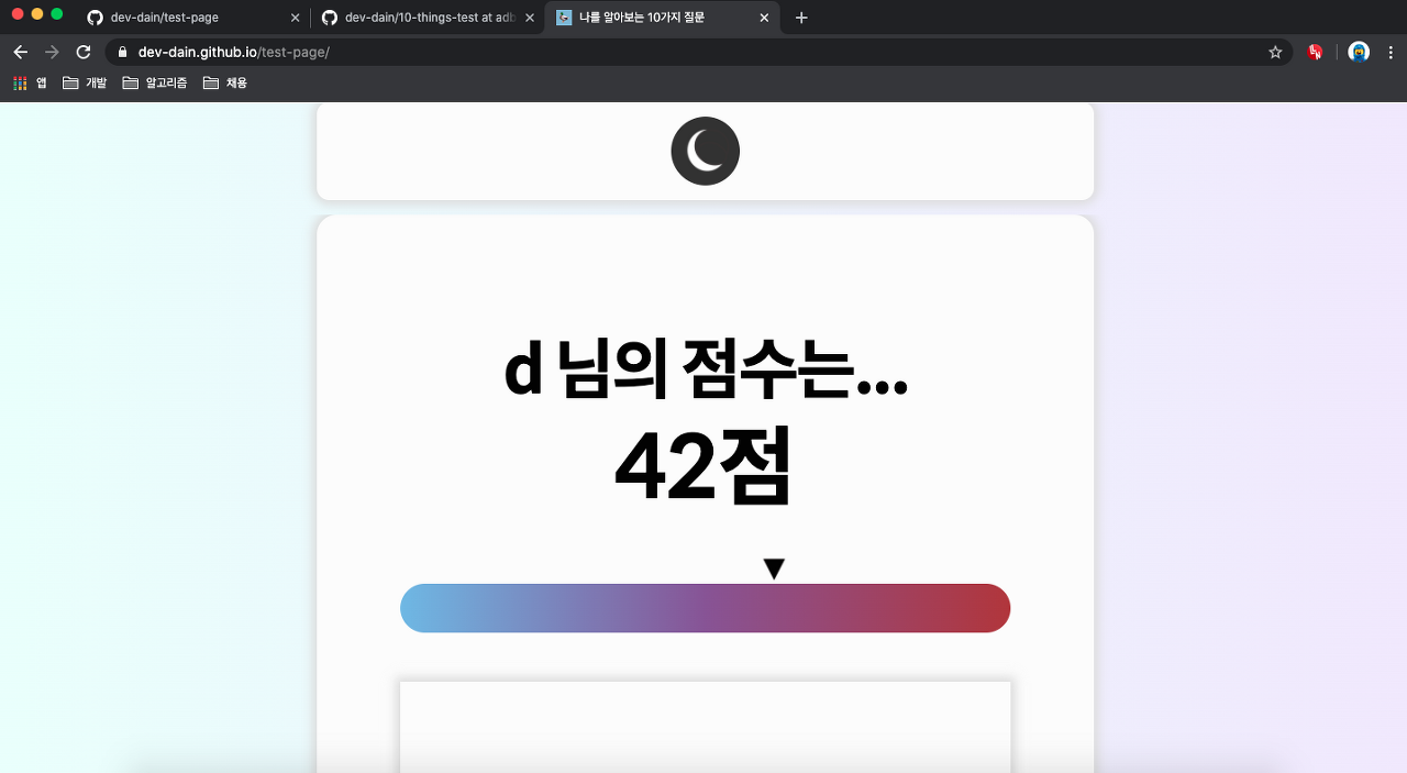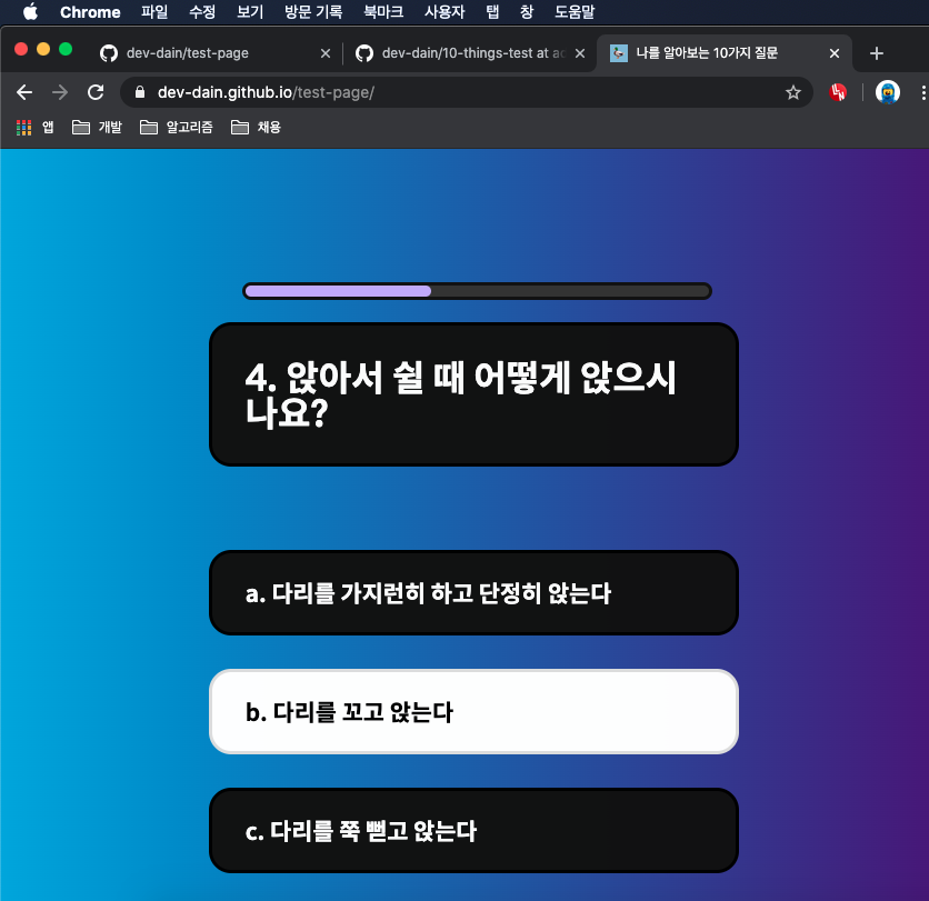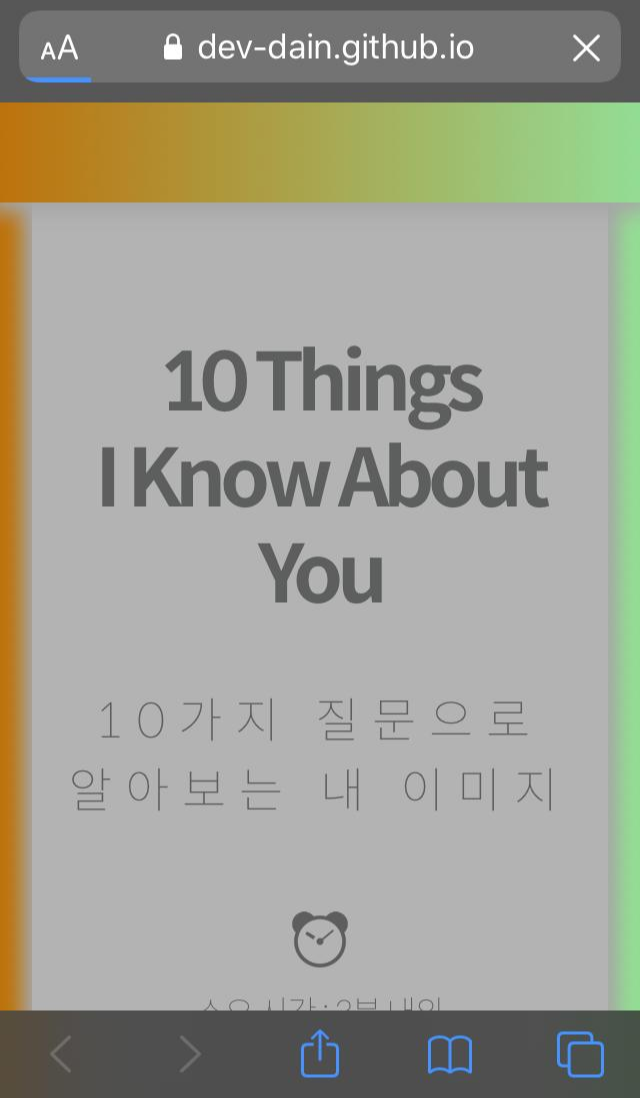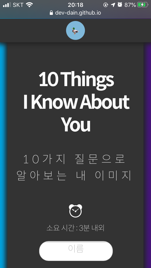 나를 알아보는 10가지 질문 사람들이 보는 나는 어떤 이미지일까? dev-dain.github.io 이전 글 보기 [이미지테스트 페이지 만들기] 2~4일 - 미디어 쿼리로 반응형 웹 만들기, CSS 애니메이션 나를 알아보�