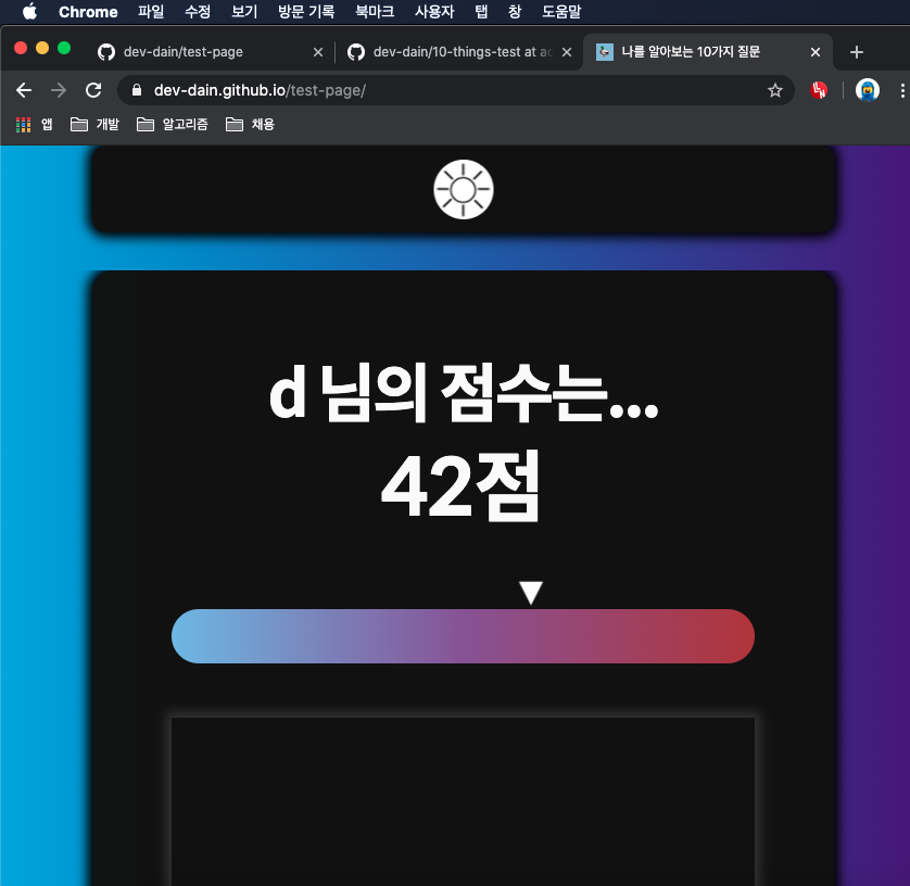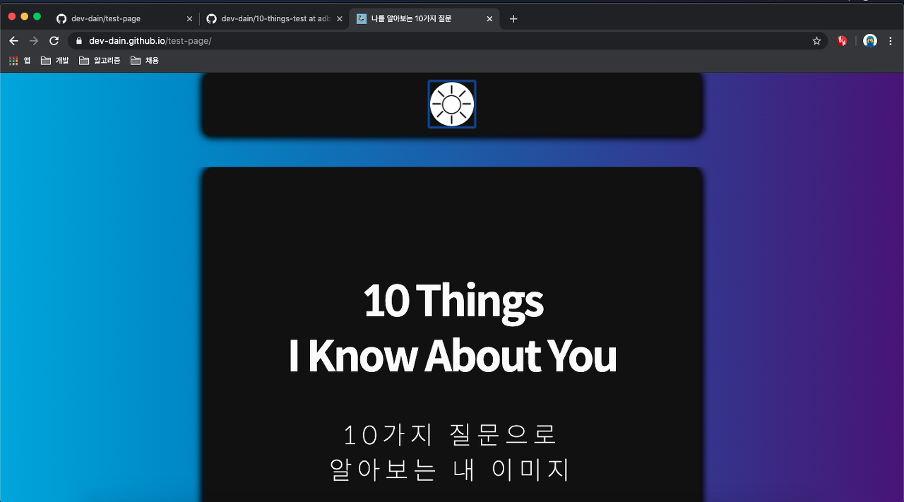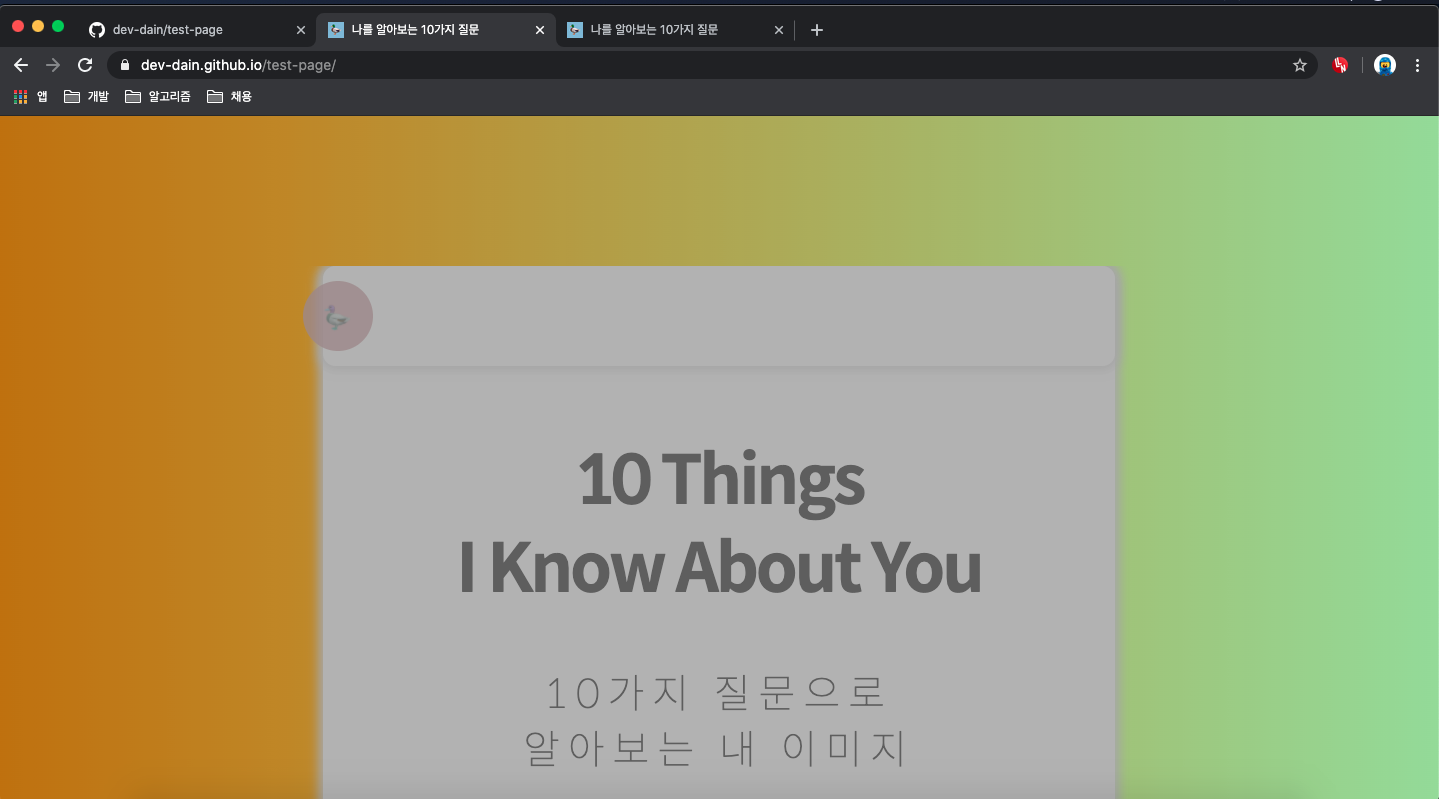 나를 알아보는 10가지 질문 사람들이 보는 나는 어떤 이미지일까? dev-dain.github.io 10일 개발이 다 끝났으니 CSS 순서 정리를 하기로 했습니다. 순서 정리하는 방법은 모르지만 파일을 보니 제 css 파�