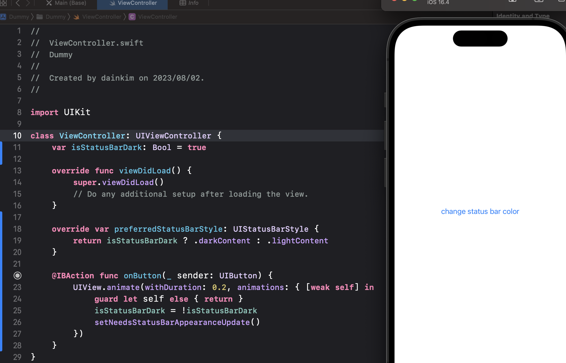 Info.plist에 뭔가 추가할 필요는 딱히 없다. 예전에는 UIViewControllerBasedStatusBarAppearance 키의 값을 변경해줘야 하고 그랬어야 되나 본데, 글을 쓰는 지금(2023년 8월), xcode 14.3, minimum deployment 14.0 버전에서는 그렇게 해주지 않아도 잘 동작한다.