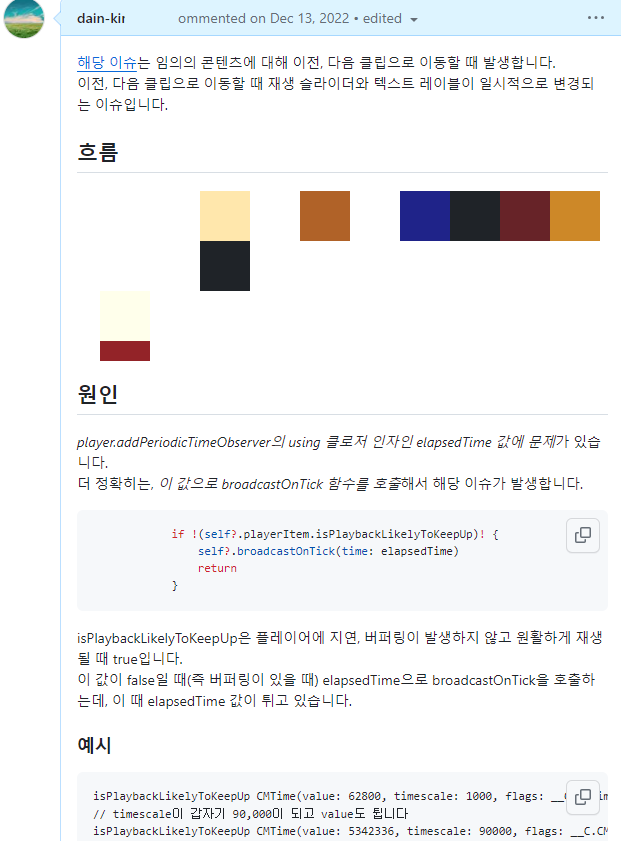 이슈는 금방 닫을 수 있었고, 조금 행복해졌다. 앱의 핵심인 플레이어를 조금 더 잘 알게 됐다는 생각이 들어서였다.
