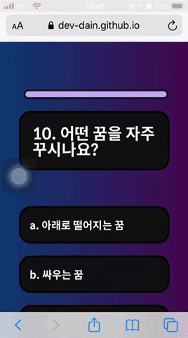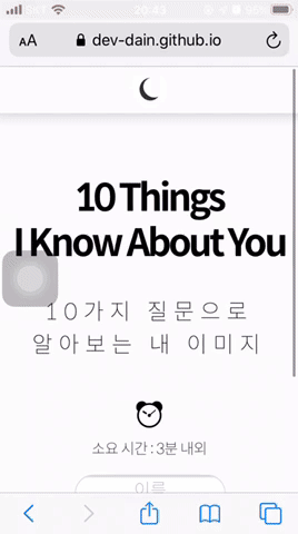 나를 알아보는 10가지 질문 사람들이 보는 나는 어떤 이미지일까? dev-dain.github.io 이렇게 개발이 끝났습니다. 한 일주일 잡았는데 뒤늦게 생각지도 못한 다크모드 지원이나 그림 받는 일정 조율 ��