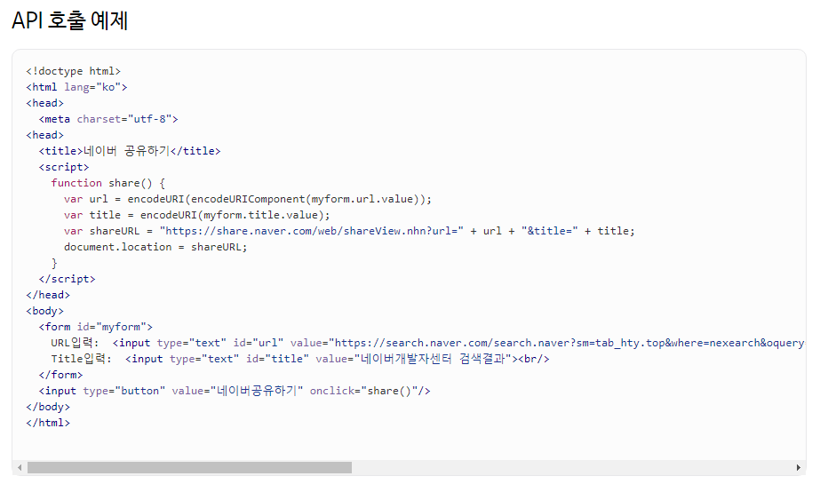 - 예를 들어 내가 네이버를 통해 내 페이지를 네이버 서비스에 공유하고 싶다면 네이버에서 제공하는 공유하기 API를 문서에서 제시하는대로 맞춰서 쓰면 된다.