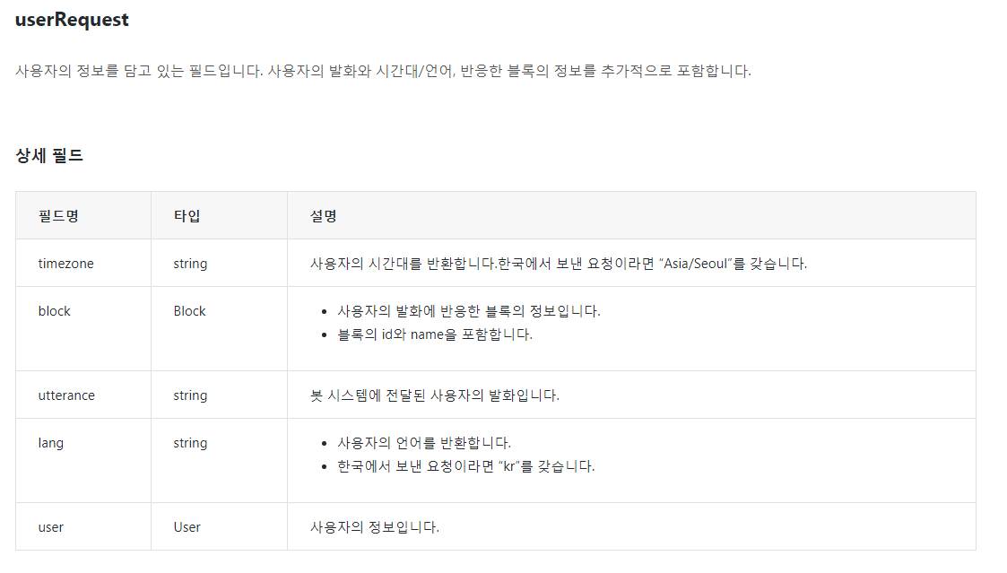 일단 request가 뭔지 살펴봐야겠습니다. 공식 문서를 보면 봇 시스템은 스킬 서버에 HTTP POST Request(body는 json)을 보내고 스킬 서버는 HTTP Response(body json)을 요청한 봇 시스템으로 보내 줍니다. message 에서 받는 request 가 POST Request 인 것을 알 수 있습니다. 이 request.body 를 까보면 json 형식의 payload 인데 이것을 utf-8 방식으로 디코딩해서 answer 라는 변수에 집어넣는 게 첫 줄의 의미입니다. 그리 까다롭진 않습니다.