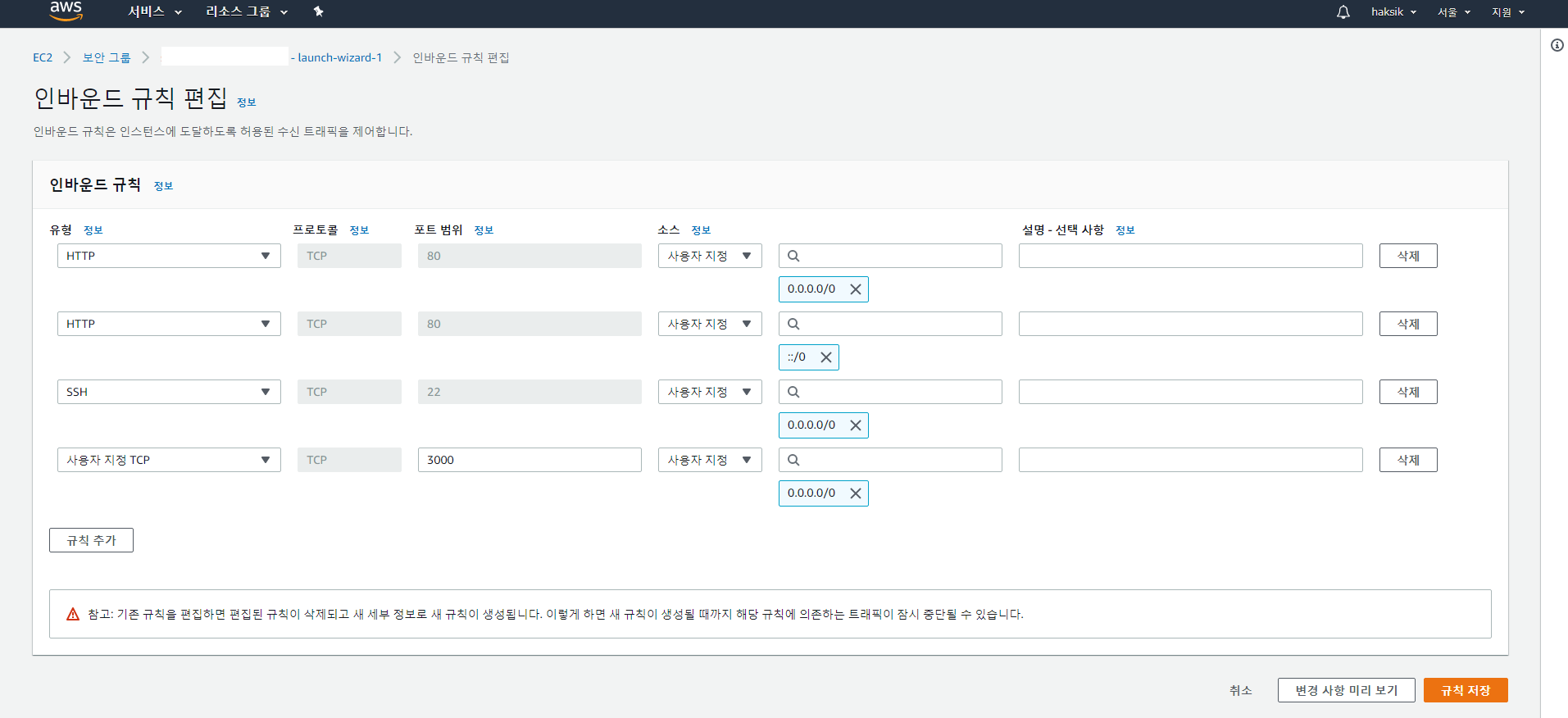 이제 프로젝트 베이스가 되는 폴더를 만들고 거기서 앱을 하나 작성해볼 건데요. 그 전에 할 일이 하나 있습니다. 보통 node 앱은 3000 포트를 많이들 엽니다만 ec2 최초 보안 규칙상 인바운드 포트로 3000이 없고 22, 80 정도만 있는 경우가 많습니다. 사실 3000이 됐든 5000이 됐든 여러분의 앱이 쓰고자 하는 포트를 사용하려면 보안 규칙에서 해당 포트를 인바운드로 열어줘야 합니다. 여기서는 3000번 포트를 쓰기로 합니다.