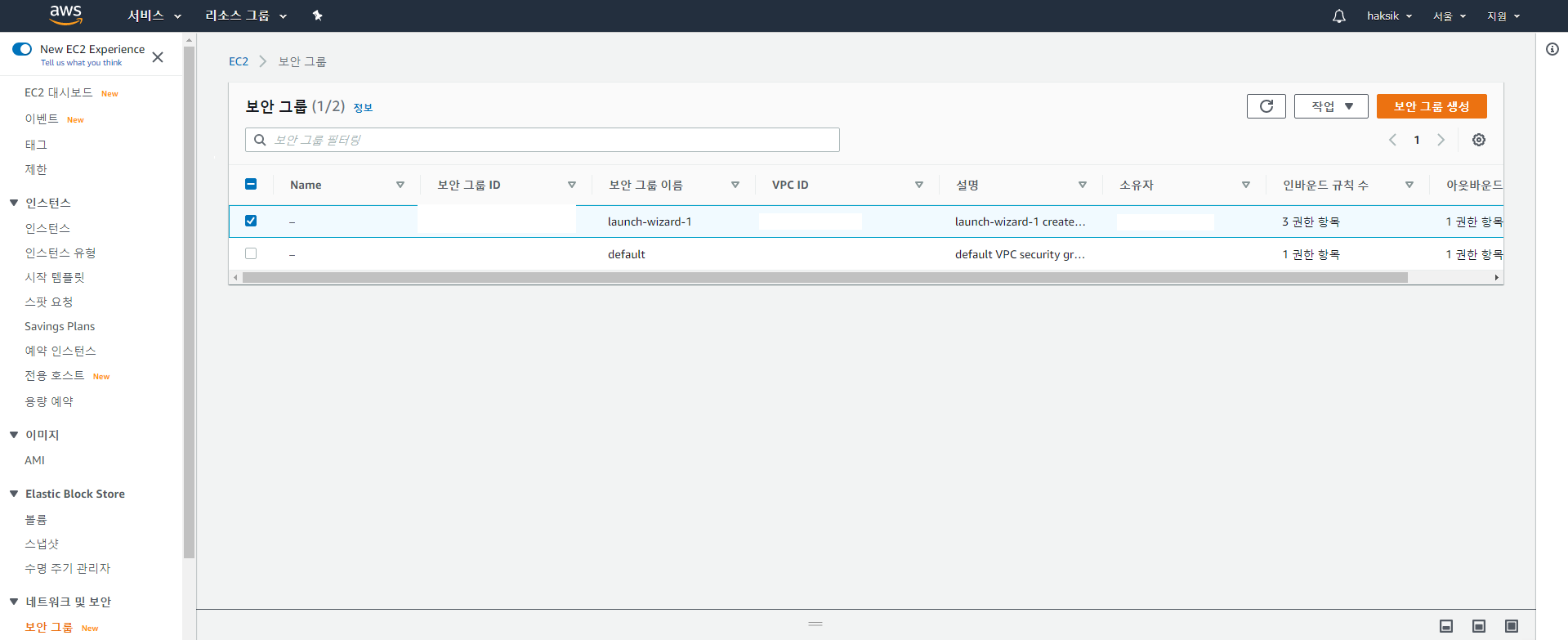 AWS 홈페이지로 가서 계정에 로그인하고 EC2 대시보드로 이동합니다. '네트워크 및 보안 > 보안 그룹'을 클릭하면 다음과 같은 화면이 나옵니다.