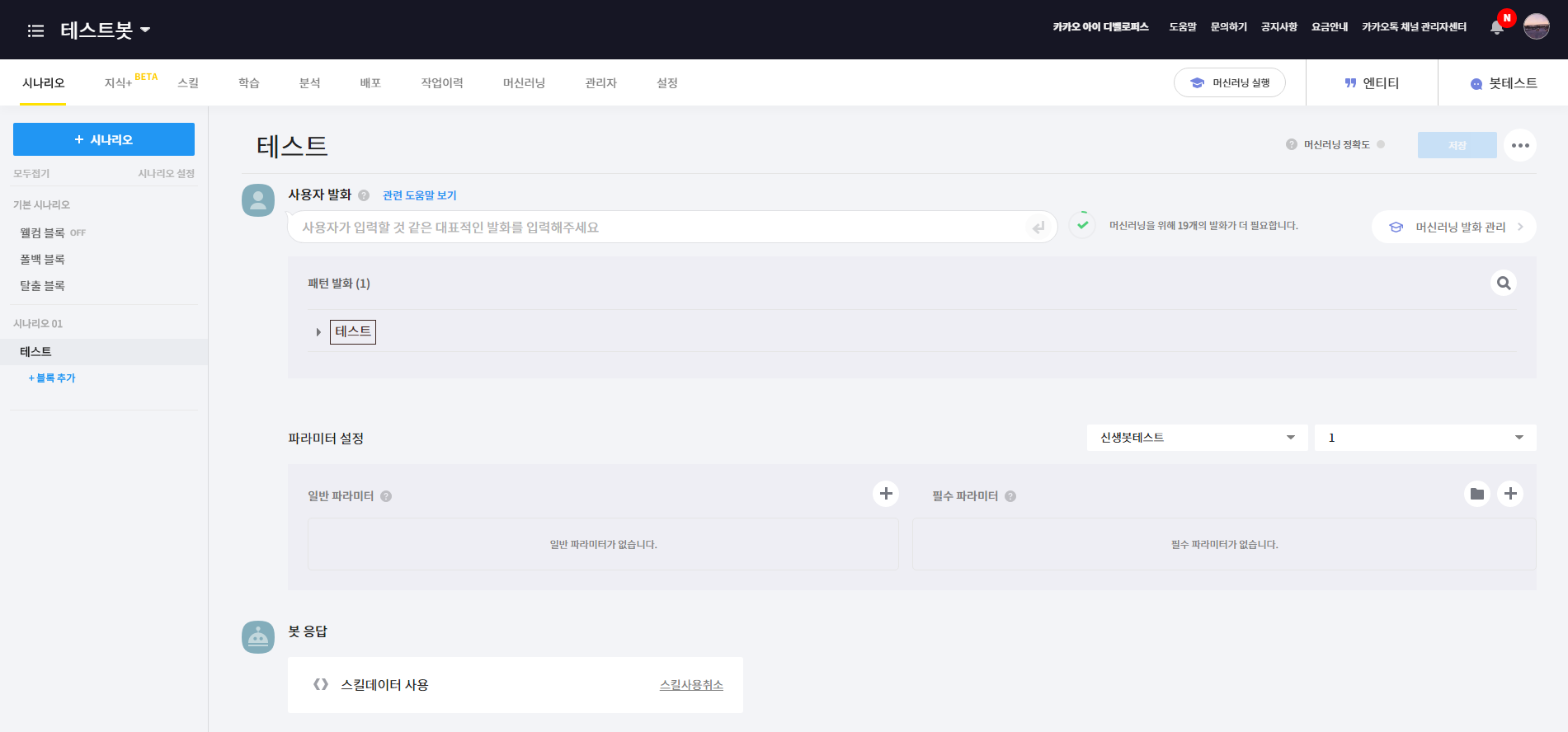 시나리오 탭으로 넘어와서 시나리오를 추가하거나 기존에 있는 시나리오 01에 블록을 추가합니다. 저는 '테스트'로 이름을 정했습니다. 그리고 사용자 발화에 '테스트'를 입력한 뒤 봇 응답에서 '스킬데이터 사용'을 누른 다음 저장합니다.