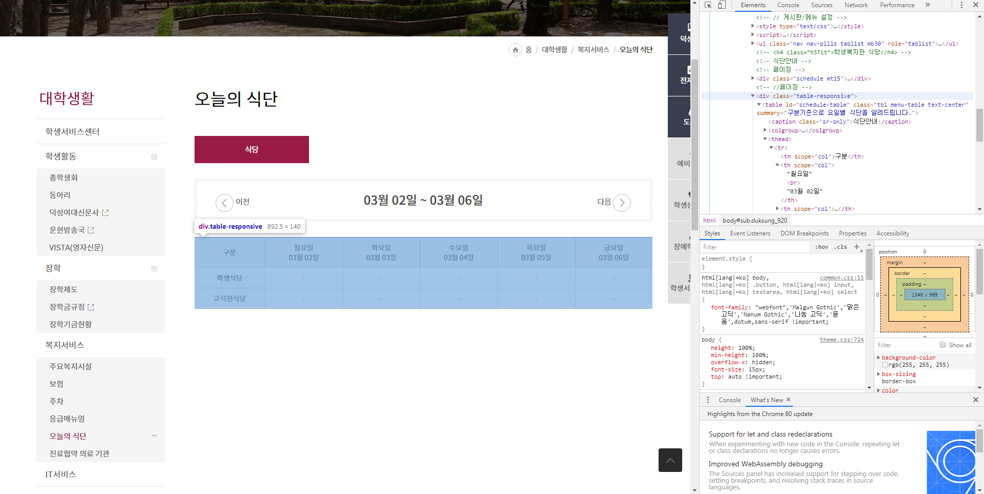 <div class="table-responsive">에 커서를 가져가니 우리가 찾는 테이블이 보입니다. 파이어폭스에서 열어본 소스코드에서 확인해보면, 이 코드가 있긴 하지만 div 안의 table 안이 완전히 비어 있습니다. 반면 여기서는 우리가 보는대로 월요일과 3월 2일 등의 데이터를 확인할 수 있습니다. 이것이 브라우저 내장 자바스크립트 엔진이 스크립트를 처리했느냐 안 했느냐의 차이입니다.