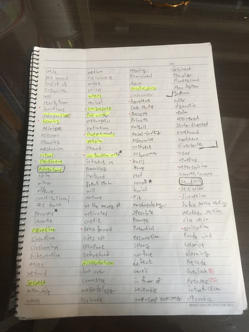 얇은 스프링 노트를 한 권 준비해 세로로 4등분하고 앞장에는 단어만, 뒷장에는 뜻만 적습니다. 이렇게 하는 이유가 있습니다. 보통의 단어장은 단어와 뜻이 한 면에 있는데요. 이 때는 곁눈질로 보고 내가 뜻을 안다고 착각할 수 있기 때문입니다. 하지만 단어와 뜻이 다른 면에 분리되어 있다면 진짜 모르는 단어를 알아내서 집중 마킹할 수 있습니다. 막판에는 그럴 시간조차 없어서 그냥 교재에 연필로 긋고 계속 보며 외웠네요.