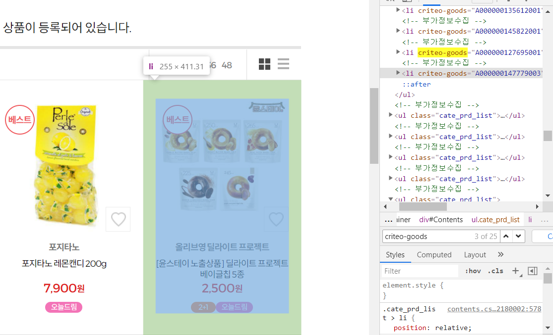 실제로 세부 카테고리의 상품 리스트들을 볼 수 있는 페이지에는 criteo-goods라는 li 태그로 각 상품을 감싸고 있었습니다.
