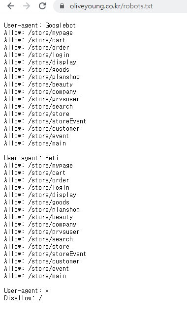어떤 홈페이지 타겟으로 크롤링을 하실 때는 반드시 해당 홈페이지의 robots.txt를 확인하고, user-agent *에서 allow가 되어 있는 부분만 크롤링하도록 합시다. 아직은 권고 사항 정도라서 큰 효력을 갖지는 않고, 학습 용도라면 크롤링을 눈 감아주는 분위기지만 너무 어뷰징해서 트래픽 폭주하면 문제의 소지가 될 수 있습니다.