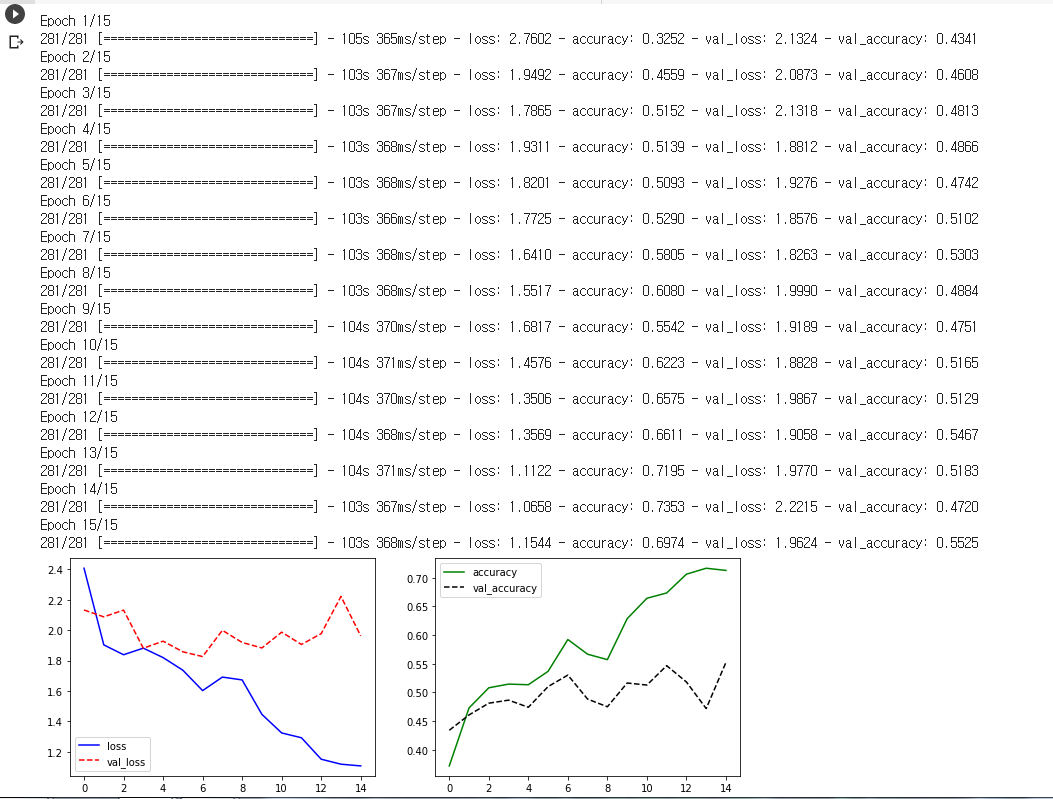 loss와 val_loss가 거의 비슷하게 떨어진다. accuracy와 val_accuracy도 비슷하게 떨어진다. 학습이 잘 되고 있음을 보여 준다. val_loss 1.11, val_accuracy 0.74이다. 또한 에포크당 20초라서 똑같이 15 epochs를 학습해도 SimpleRNN보다 학습 과정이 빠르다.