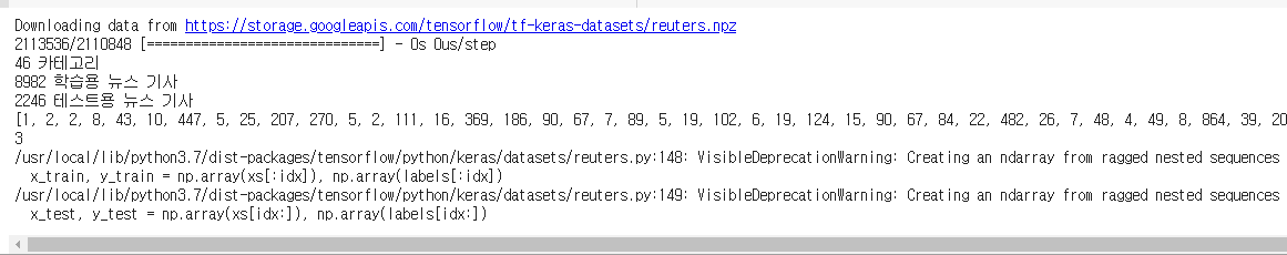 실행 결과는 다음과 같다. 카테고리는 46개이고, 학습용으로 8982개, 테스트용으로 2246개 기사가 있다.
