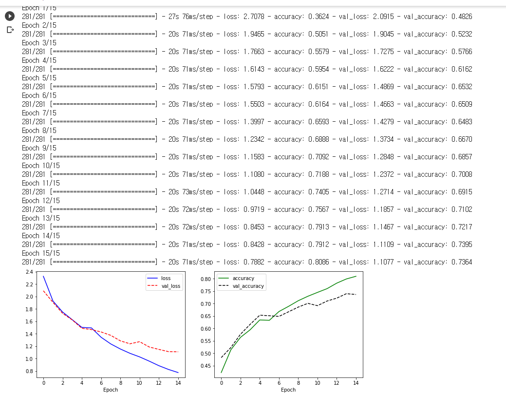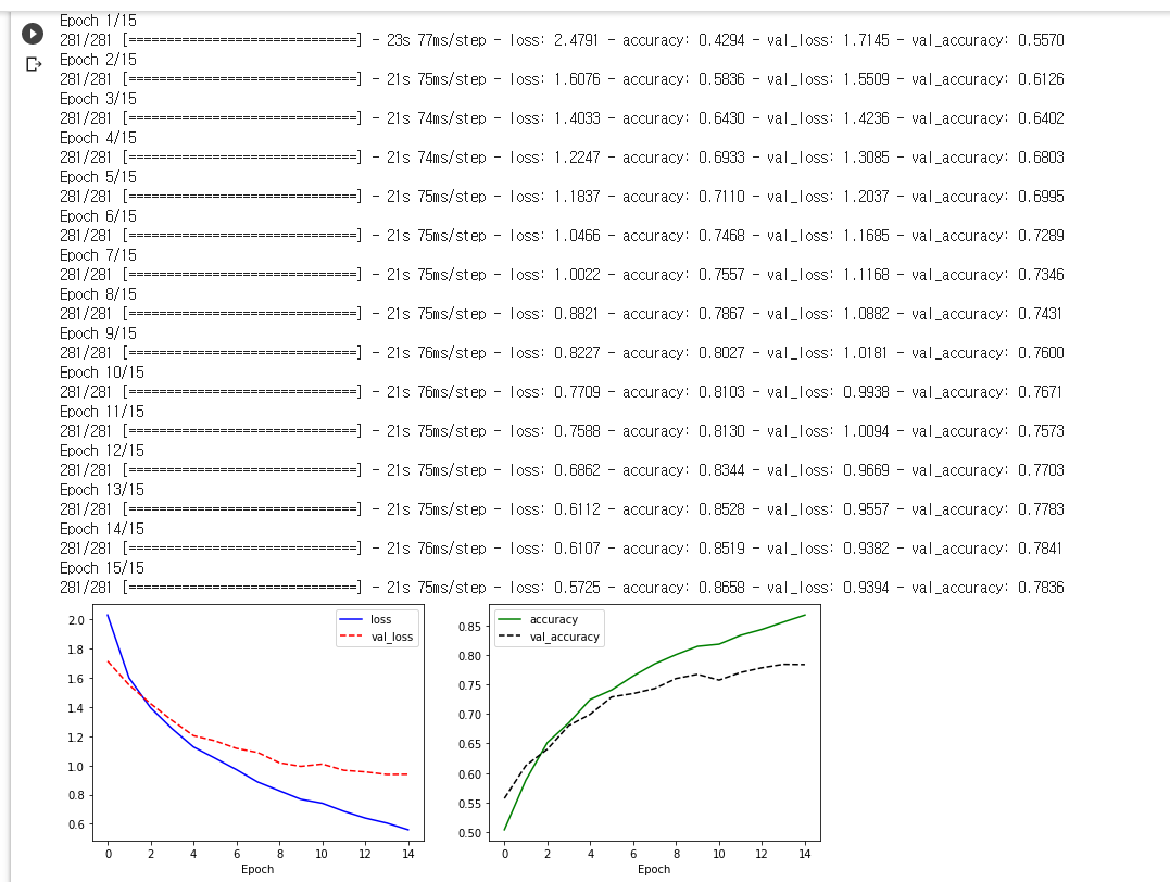 10 에포크가 지나자 살짝 과적합의 조짐이 보인다. val_accuracy도 의미있게 상승하지 않는다. 최종 결과는 val_loss 1.03, val_accuracy 0.78이다.