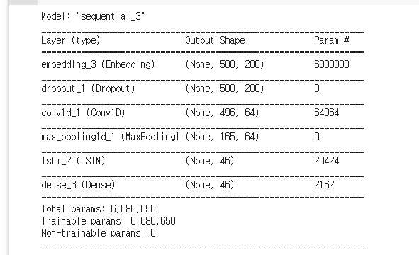 다음은 CNN + LSTM이다. CNN이라니 무슨 뜻일까? 원핫 인코딩을 거친 데이터는 배열이 된다는 것을 위에서 짚고 넘어갔다. 이 1차원 배열에 대해 컨볼루션을 적용하고 LSTM 레이어를 연결하는 것이 CNN + LSTM 조합이다. 보통 임베딩 후 CNN 연산하듯 Dropout도 하고, Conv1D 레이어를 쓰고 Pooling1D도 한다. CNN은 이미지 컨볼루션에 자주 쓰이는 모델이다. Fashion MNIST 같은 데이터셋을 분류할 때는 Conv2D 레이어(이미지는 가로/세로 2차원 배열이니까)를 자주 썼지만, 이 경우는 텍스트라서 Conv1D 연산을 할 수 있다. 역시 텍스트라서 풀링도 1D로 해준다.
