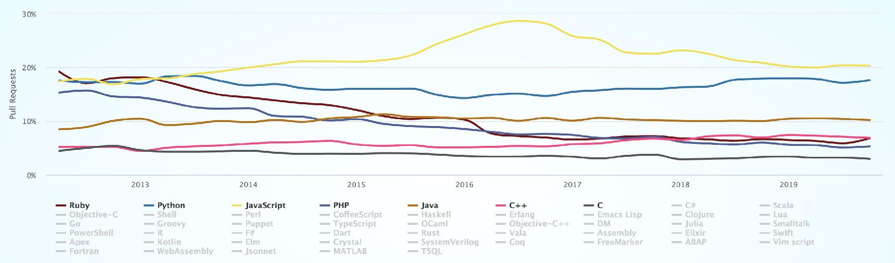 NodeJS가 좋긴 하지만 데이터 사이언스와 엔지니어링 커뮤니티에서의 인기로 따져보면 파이썬도 꾸준히 성장 중인 또 다른 인기 언어라고 할 수 있습니다. PHP와 Ruby는 아직 정정하고 구직 시장에서 선택지도 있지만 JS와 파이썬만큼 인기 있지도 않고 전반적인 상승세에 있는 것도 아닌 것 같습니다.