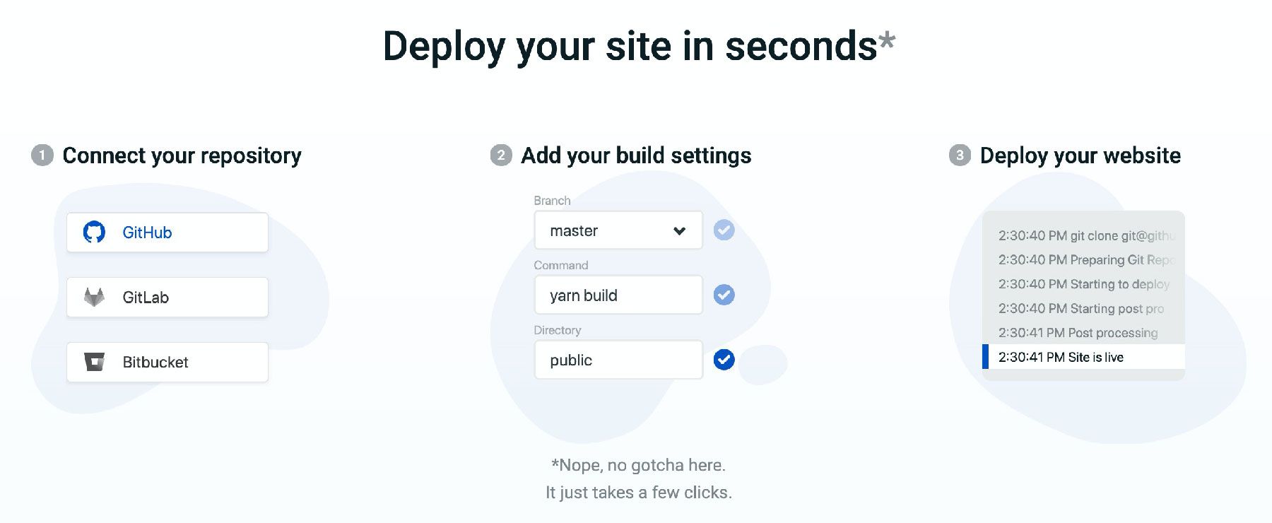 예전에 조금 다뤄봤더라도 수면 아래 뭐가 있을지 궁금해질 텐데요. Netlify는 여러분의 코드를 끌어와서 가상 환경에서 설정한 명령(yarn build 같은)을 실행하고 S3 같은 스토리지에 파일을 저장합니다. 엔드포인트에서의 서비스를 위해 클라우드 프론트(CloudFront)와 같은 CDN을 앞에 두기까지 하죠.